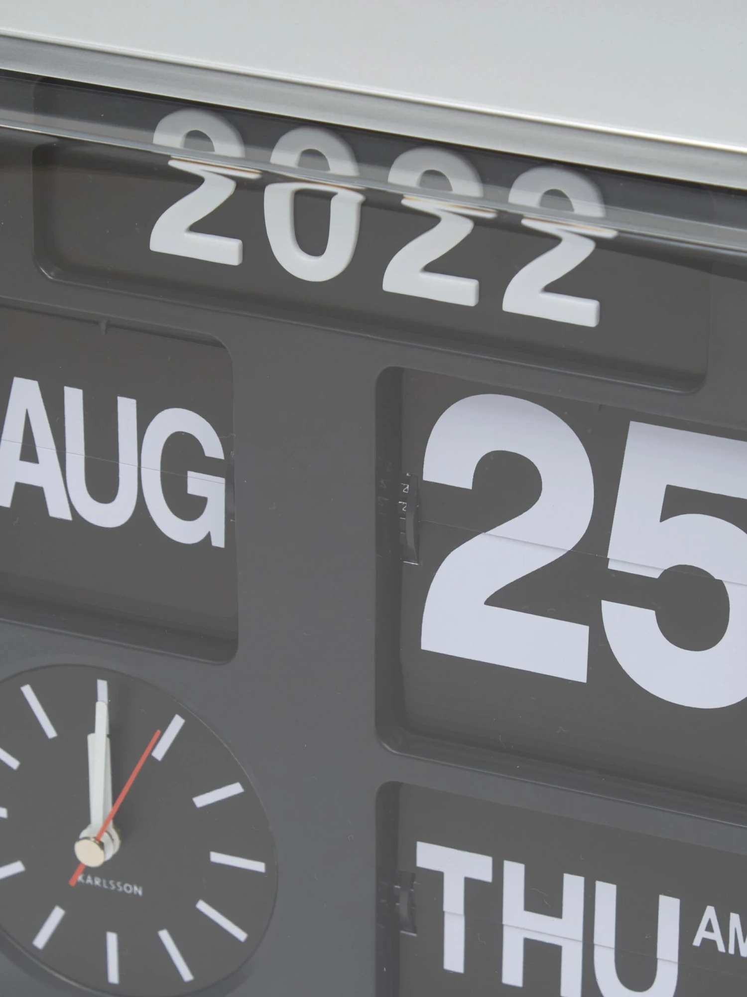 Inspired by 1950s design, this flip clock gives time, date and year all in one glance. Ideal for any room in the house. Can be hung on the wall, or positioned on any surface.